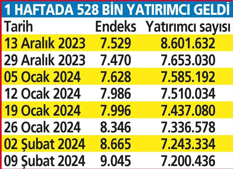 Türkiye'nin 5 yıllık kredi risk primi (CDS) 290 baz puana gerileyerek 1.5 ay sonra tekrar 300'ün altına inerken, hisse senedi ile tahvilbono piyasasına yabancı girişi son sürat devam ediyor. Merkez Bankası verilerine göre, yabancı yatırımcılar 27 Ekim 2023 ile 9 Şubat 2024 tarihleri arasındaki 15 haftalık dönemde Türkiye'ye hisse senedi, tahvil-bono ve teminat ile ters repo pazarında toplam 5 milyar 994 milyon dolarlık net giriş gerçekleştirdi.