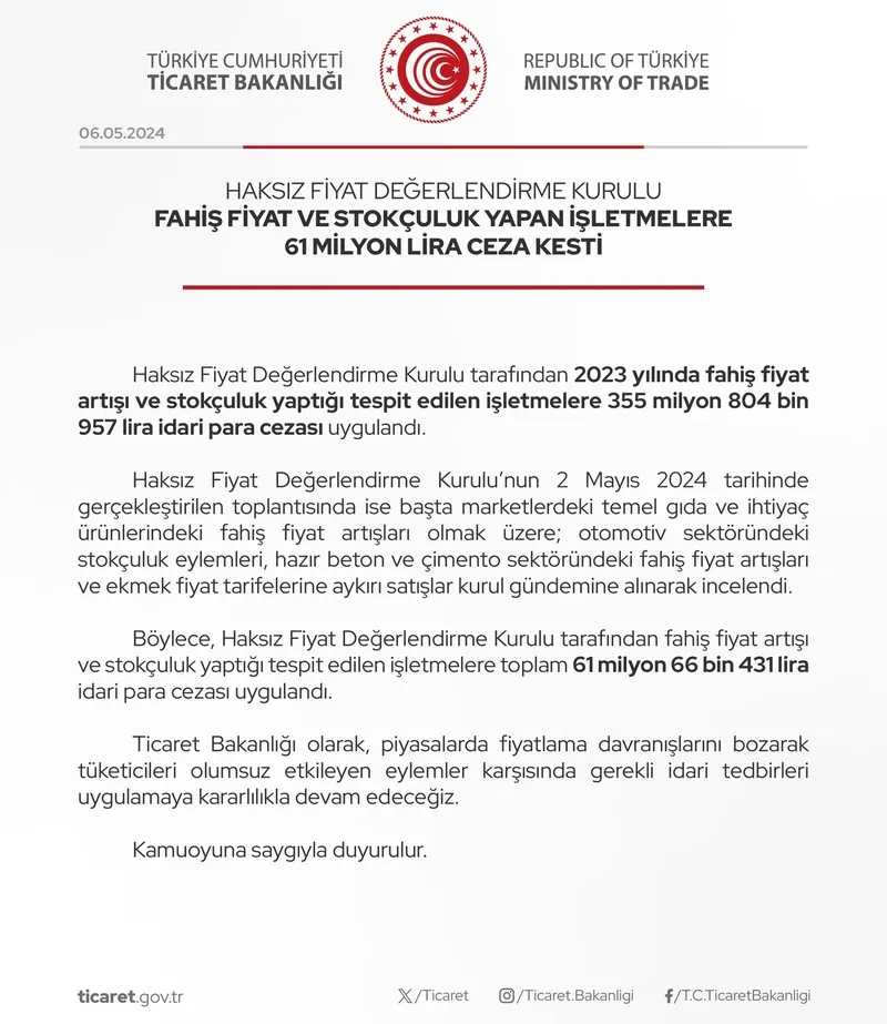 Ticaret Bakanlığı olarak, piyasalarda fiyatlama davranışlarını bozarak tüketicileri olumsuz etkileyen eylemler karşısında gerekli idari tedbirleri uygulamaya kararlılıkla devam edeceğiz."
