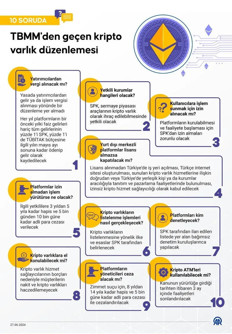 Türkiye'de kripto varlıklara ilişkin ilk yasal düzenleme TBMM'den geçti. Sermaye Piyasası Kurulu, sermaye piyasası araçlarının kripto varlık olarak ihraç edilebilmesinde yetkili olacak. Peki, düzenlemeyle kripto varlık ekosisteminde neler değişecek? Kripto ATM'leri kullanılabilecek mi? Kripto varlıklara el konulabilecek mi? İşte 10 soruda kripto varlıklarda yeni dönem.