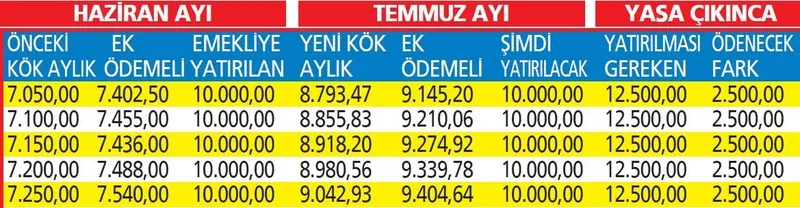 Örneğin; kök aylığı 7 bin 500 lira olan emekli, 300 lira ek ödeme ve 2 bin 200 lira Hazine desteğiyle (5510 Ek 19 ödemesiyle) birlikte 10 bin lira alıyordu. Bu emeklinin yüzde 24.73 zamla yeni kök aylığı 9 bin 354 lira 75 kuruşa, ek ödemeli aylığı 9 bin 728 lira 94 kuruşa çıktı. Bu emekliye şimdi 10 bin lira yatırılacak. Ancak yeni taban aylık uygulamaya alındığında emeklinin geliri 12 bin 500 liraya çıkacak. Düzenleme yürürlüğe girdiğinde emekliye 2 bin 500 lira fark ödenecek.
