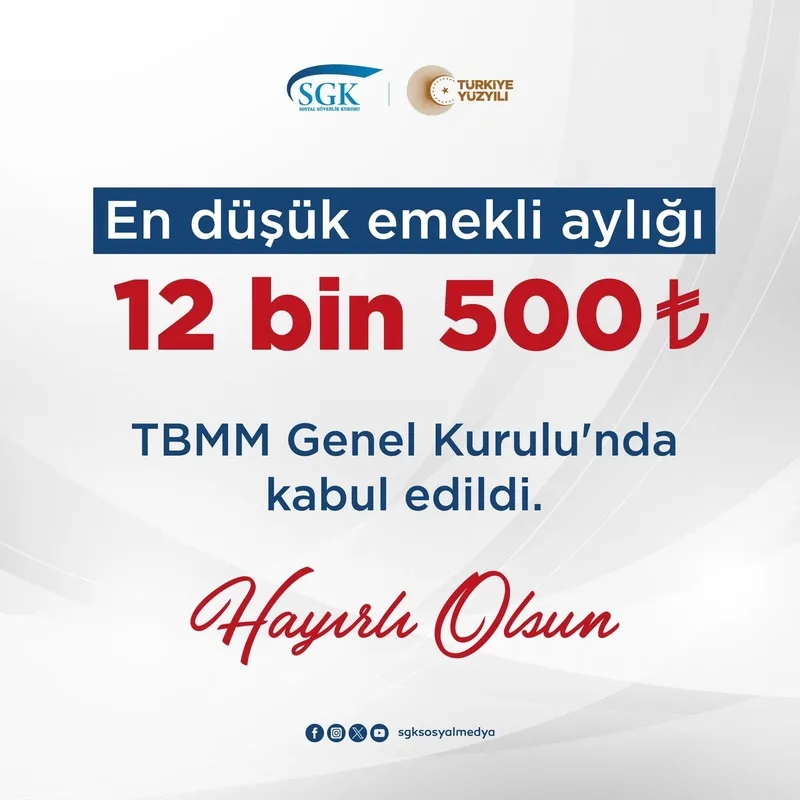 Konuyla ilgili SGK'dan yapılan açıklamada, "En düşük emekli aylığını 12 bin 500 TL'ye yükselten 29. madde TBMM Genel Kurulu'nda kabul edildi. Hayırlı Olsun." denildi.