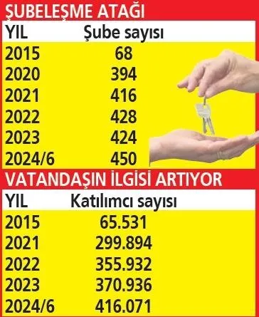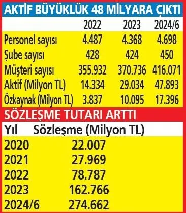 Tasarruf finansman sektörünün yakaladığı işlem hacmi 4 kat artışla Haziran 2024'te 111 milyar TL'yi aşarken, toplam sözleşme tutarı da yüzde 157 artış ile 275 milyar TL'ye ulaştı. Sektörün aktif büyüklüğü 48 milyar TL'ye, öz kaynakları ise 18 milyar TL'ye yükseldi. 2022 sonunda 14 milyar 334 milyon lira olan aktif büyüklükte 1.5 yıllık büyüme yüzde 234'e ulaştı. Aynı dönemde öz kaynaklardaki büyüme yüzde 353 olarak gerçekleşti.