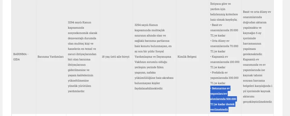 Betonarme Ev Yapımı veya Ev Alımı: 500.000 TL'ye kadar yardım yapılmaktadır.