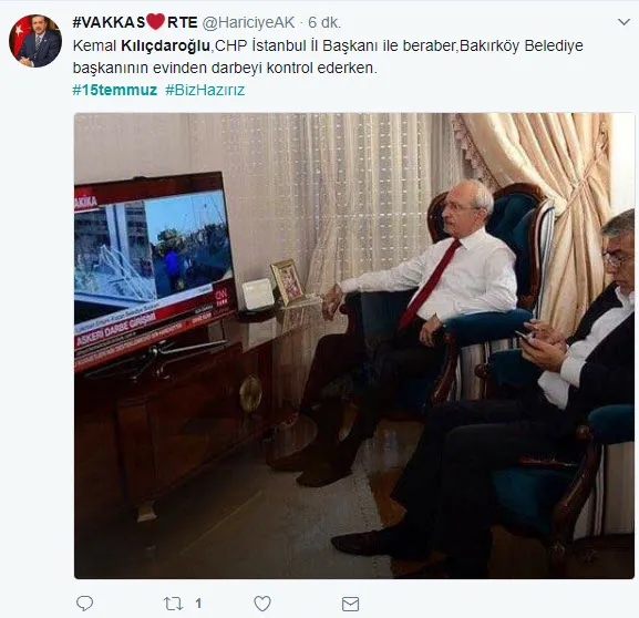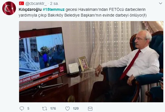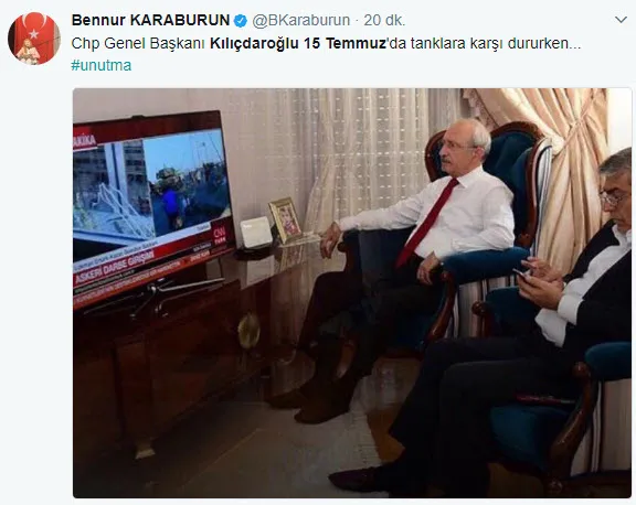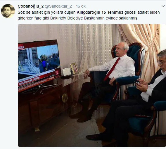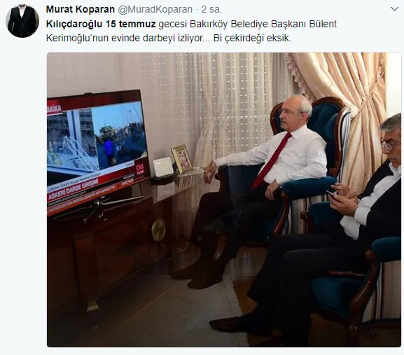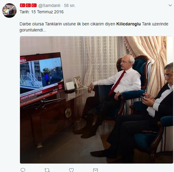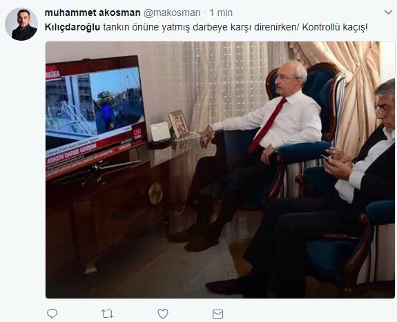 15 Temmuz öncesinde "Darbe olursa tankın önüne ilk ben çıkarım" deyip hain darbe kalkışması sırasında Atatük Havalimanı'nda tanklara selam durması ve darbe haberini alınca Bakırköy Belediye Başkanı'nın evine kaçmasıyla çok tartışılan Kılıçdaroğlu'nun Temmuz gecesi ekran başında darbe girişimini izlerken çekilen fotoğrafları sosyal medyada yayılmaya başladı.