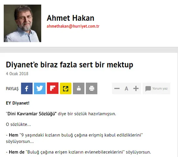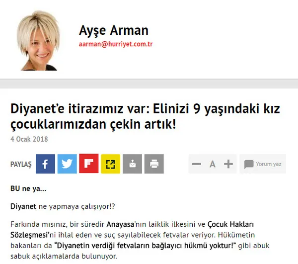 Sözcü gazetesi Diyanet İşleri Başkanlığı üzerinden 28 Şubat kafasıyla kirli ve art niyetli çarpıtma operasyonu başattı. Ardından Cumhuriyet ve Hürriyet de provokasyon kervanına katıldı. O bilindik taktiklerle bilindik korkuları yaratmaya çalıştılar. Hürriyet gazetesi haberleriyle ve yazarlarıyla tam gaz çarpıtma ve algı operasyonu yaptı. Gazetenin yazarları Ahmet Hakan ve Ayşe Arman olmayan bir açıklama sanki varmış gibi Diyanet'e tepki gösterdi ve karalamaya çalıştı. Doğan medyası toplumda bir tepki oluşsun diye yalanı büyüttü. Diyanet, 'Böyle bir açıklama yapılmadı' demesine rağmen yalanlarından ve algı operasyonundan vazgeçmediler, "Diyanet, 9 yaşındaki kız evlenebilir dedi" yalanına devam ettiler.
