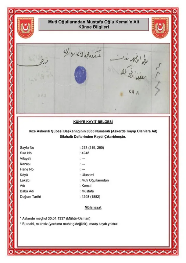 Bakanlıktan yapılan açıklamada son günlerde, Cumhurbaşkanı Recep Tayyip Erdoğan'ın dedesinin 1. Dünya Savaşı'ndaki Sarıkamış Harekatında şehit olduğuna dair Milli Savunma Bakanlığı arşiv kayıtlarında isminin yer almadığına ilişkin bazı iddialar olduğu belirtildi. Milli Savunma Bakanlığından yapılan açıklamada, "Milli Savunma Bakanlığı tarafından yapılan arşiv taramaları sonucunda; Rize Askerlik Şubesi Başkanlığına ait 8355 Numaralı Askerde Kayıp olanlara ait Silahaltı defterinin 213'üncü sayfasında, Rize ili Ulucami köyünden Mutioğullarından lakaplı Mustafa oğlu 1882 doğumlu Kemal'in askerde meçhul 30.01.1337 (Mühür-Osman) şeklinde yazılı olduğu tespit edilmiştir" denildi.