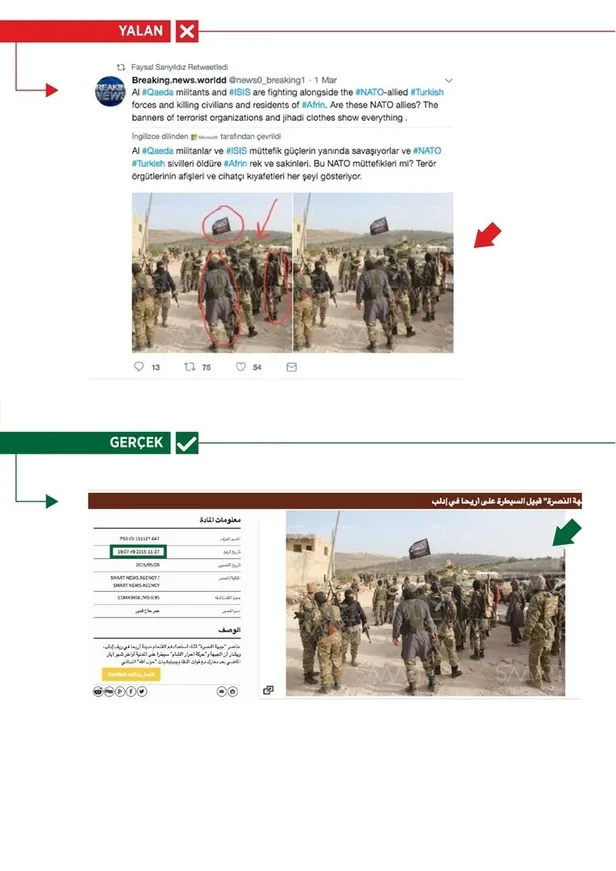 Terör örgütü PYD/PKK destekçilerinin sosyal medyada, Türk Silahlı Kuvvetlerinin (TSK) Afrin'de yürüttüğü Zeytin Dalı Harekatı'nı karalamak için paylaştığı iki fotoğrafın daha gerçekle ilgisi olmadığı belirlendi.