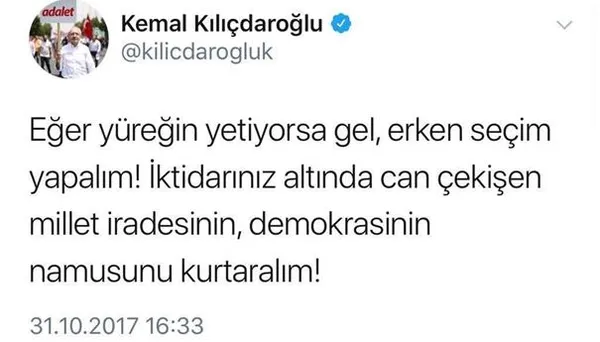 Kemal Kılıçdaroğlu, sosyal paylaşım sitesi Twitter'daki şahsi hesabından açıklamada bulundu ve "Eğer yüreğin yetiyorsa gel, erken seçim yapalım! İktidarınız altında can çekişen millet iradesinin, demokrasinin namusunu kurtaralım!" iddiasında bulundu.