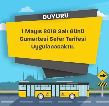İETT'nin yaptığı açıklamada, "1 Mayıs 2018 Salı günü hatlarımız Cumartesi sefer saatleri ile çalışacak olup Bulunmuş Eşya Büromuz kapalı olacaktır. Yolcularımıza duyurulur" denildi.