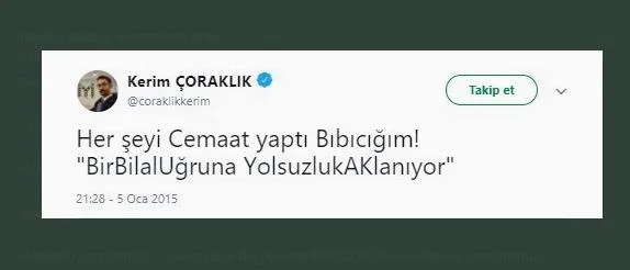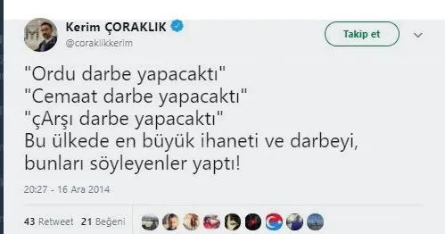 Kerim Çoraklık, 4 Şubat 2015 tarihli paylaşımında, "Cemaat, Cumurbaşkanı'na kafayı yedirmek suretiyle darbeye hazırlanıyor. Kesin bilgi yayalım! RT RT RT" ifadelerini kullanmış