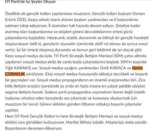 İYİ Parti'nin Genel Merkez İletişim Sorumlusu Kerim Çoraklık'ın FETÖ propagandası suçunu işlediğine yönelik paylaşımları şöyle: