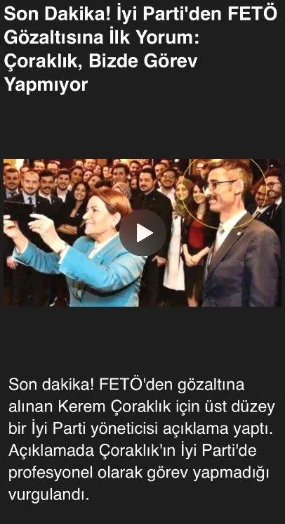 Meral Akşener'in genel başkanlığını yaptığı İYİ Parti'nin Genel Merkez İletişim Sorumlusu Kerim Çoraklık FETÖ propagandası suçunu işlediği gerekçesiyle gözaltına alındığı bildirildi.