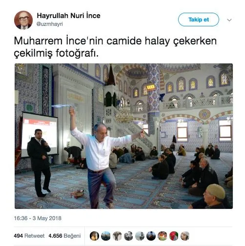 Muharrem İnce'yi bir camide halay çekerken gösteren fotoğrafın ilk defa "Hayrullah Nuri İnce" isimli Twitter kullanıcısı tarafından 3 Mayıs'ta oluşturulup paylaşıldığı görülüyor.