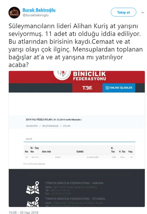 *Alihan Kuriş'e ait 11 adet at bulunduğu bilgisi Avukat Burak Bekiroğlu tarafından sosyal medyada paylaşıldı