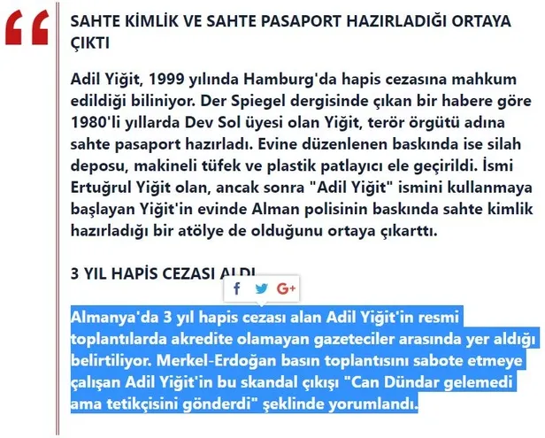 Almanya radikal örgütçülükten 3 yıl hapis yatan ve 1996'daki operasyonda evinde çok sayıda mühimmat bulunan terörist Adil Yiğit'i, Başkan Recep Tayyip Erdoğan'ın ve Almanya Başbakanı Merkel'in olduğu salona alarak iki liderin can güvenliğini hiçe saydı.