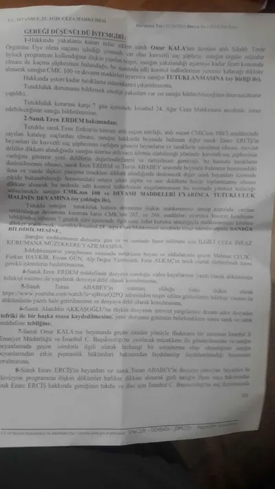 İstanbul 23. Ağır Ceza Mahkemesi; Karşı Gazetesi Genel Yayın Yönetmeni ve eski CHP Milletvekili Eren Erdem'in tutukluluğunun devamına oy birliğiyle karar verdi. Mahkeme kararında; tutuklu sanık Eren Erdem'in atılı suçun niteliği, atılı suçun CMK'nın 100/3 maddesinde sayılan katolog suçlardan olması, Eren Erdem hakkında beyanda bulunan diğer sanık Emre Erciş'in beyanları ile kuvvetli suç şüphesinin varlığını gösterir beyanları, tanıkların sunulmuş olması, mevcut delillerin dikkate alındığında Eren Erdem'in üzerine atılı suçu işleyebileceği yönünde kuvvetli suç şüphesinin varlığını gösterir yeni delillerin değerlendirilmesi ve tartışılması gerektiğine dikkat çekildi. Kararda; tanıkların dinlenilmemiş olmaması dikkate alınarak adli kontrol tedbirlerinin uygulanmasının bu aşamada yetersiz kalacağı gerekçesiyle CMK 100 ve devamı maddelerin uyarınca Eren Erdem'in tutukluğunun devamına karar verildi.