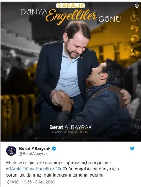 Hazine ve Maliye Bakanı Berat Albayrak, 3 Aralık Dünya Engelliler Günü nedeniyle Twitterüzerinden bir mesaj yayınladı.