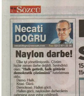 Necati Doğru'nun Sözcü Gazetesi'nde yayınlanan 17 Temmuz 2016 tarihli o yazısından bir bölüm şöyle: "Naylon darbeciler! İktidarı devirmeye kalktılar. Daha da güçlendirdiler. Yoksa bu 'tezgahlanmış bir darbe' miydi? Danışıklı dövüşten bir kalkışma mıydı? Sen kalk Cumhurbaşkanı'na darbe yaptım diye TRT'de bildiri okut, git Genelkurmay Başkanı'nı tutukla! Tankla TOMA'yı tokuştur. Başarısız darbe yap. Kabak gibi tutuklan. Üstün çıplak! Elin arkadan kelepçeli yere yüzü koyun uzan. Merak ediyorum: Bu darbecilerin tamamı, süzme saf Fethullahçı subaylar mıdır? Yoksa aralarına karışmış başkaları da var mıdır? Kutulardan dolar çıktığı o 17-25 Aralık gününden bu yana sürekli 'Fethullahçı avı' yapıldı, çok sayıda Fethullahçı tutuklandı. Buna rağmen Ordu'da 'Emir-Komuta Zinciri'ni kırıp darbe girişimine başvuracak bu kadar çok Fethullahçı subay nasıl gizli kaldı?..."