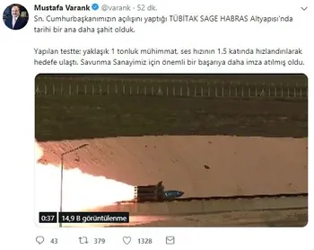 Başarılı testi Bakan Varank, sosyal medya hesabından duyurdu. Twitter'dan açıklamalarda bulunan Varank, "Sn. Cumhurbaşkanımızın açılışını yaptığı TÜBİTAK SAGE HABRAS Altyapısı'nda tarihi bir ana daha şahit olduk. Yapılan testte yaklaşık 1 tonluk mühimmat, ses hızının 1.5 katında hızlandırılarak hedefe ulaştı. Savunma sanayimiz için önemli bir başarıya daha imza atılmış oldu" ifadelerini kullandı.