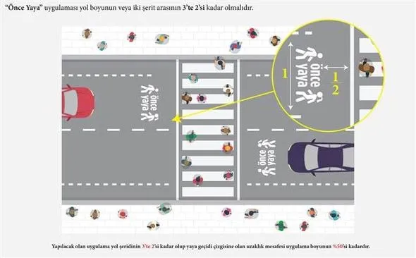 Genelgeyle, trafikte yaya önceliğine dikkat çekilmesine ilişkin hazırlanan "Önce Yaya" görsellerinin, sürücülerin görebileceği şekilde yaya ve okul geçitlerinin önüne çizilmesi istendi. Şeritlere ve geçiş çizgilerinin önüne çizilecek bu görsellerle sürücülere "önceliğin yayalarda olduğu" uyarısı yapılacak.