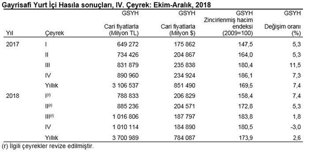 Gayrisafi Yurt İçi Hasıla dördüncü çeyrek ilk tahmini; zincirlenmiş hacim endeksi olarak (2009=100), 2018 yılının dördüncü çeyreğinde bir önceki yılın aynı çeyreğine göre %3 azaldı.