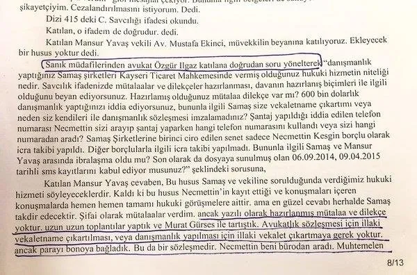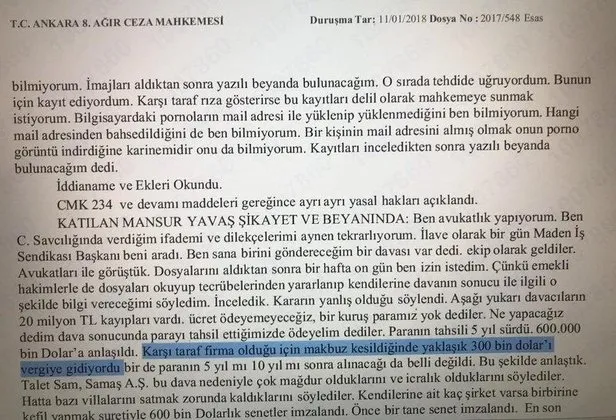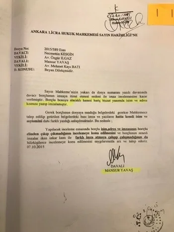Davanın duruşma zabıtlarındaki beyanlarında Yavaş, imzaların kendi yanında atıldığını iddia etmişti. Avukatlık sözleşmesi yaparak fatura kesmesi gereken Mansur Yavaş'ın herhangi bir sözleşme yapmadan senet aldığı ve ilgili vergiyi ödemediği de iddia edildi. Dosyadaki beyanlarına göre Yavaş bu durumu "Makbuz kesildiğinde 300 bin doları vergiye gidiyordu, bu yüzden senet imzalandı" diyerek açıkladı.