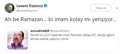 Levent Üzümcü, kendi kestiği ağacın altında kalarak can veren Akbaş ile ilgili haberi paylaşarak, "Ah be Ramazan... bi imam kolay mı yetişiyor..." notunu düştü..