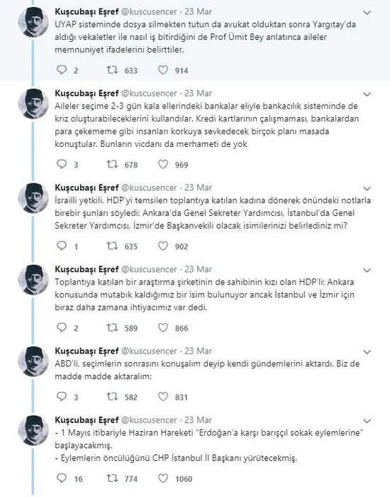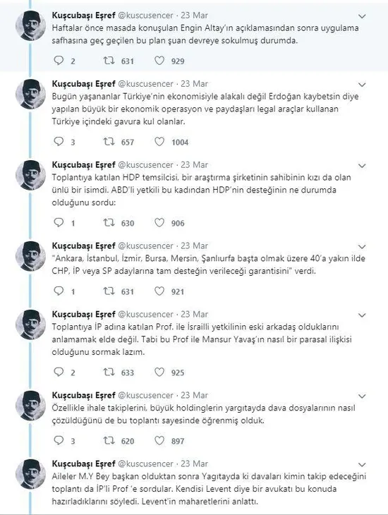 "Toplantının birinci maddesi ekonomiydi. Seçimlerde AK Parti ve MHP'nin kaybetmesi için atılacak en önemli adım yeni bir ekonomik operasyondu. Bunu şu adımlarla planladılar. Öncelikle yurt dışı kaynaklı 2 finans kuruluşuna Türkiye'de seçim araştırması yaptırılcak. Bu seçim araştırmasını AK Parti ve MHP'nin İstanbul, Ankara, Antalya ve Bursa'yı kaybetmesi üzerine kurulu olacak. Bu araştırma yurt dışı ve yurt içindeki banka-fon yöneticilerine verilecekti