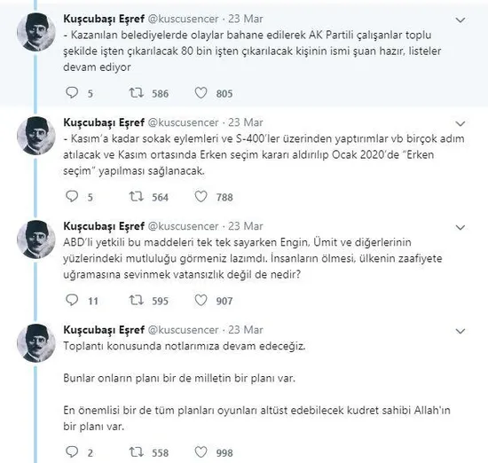 - Kasım'a kadar sokak eylemleri ve S-400'ler üzerinden yaptırımlar vb birçok adım atılacak ve Kasım ortasında Erken seçim kararı aldırılıp Ocak 2020'de "Erken seçim" yapılması sağlanacak."