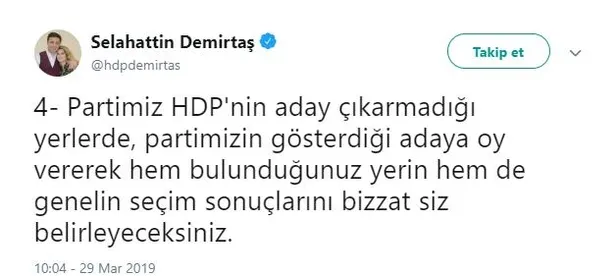 Demirtaş, Twitter hesabından yaptığı çağrıda "Partimiz HDP'nin aday çıkarmadığı yerlerde, partimizin gösterdiği adaya oy vererek hem bulunduğunuz yerin hem de genelin seçim sonuçlarını bizzat siz belirleyeceksiniz." dedi.