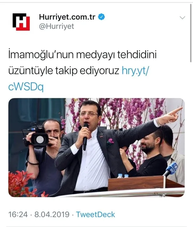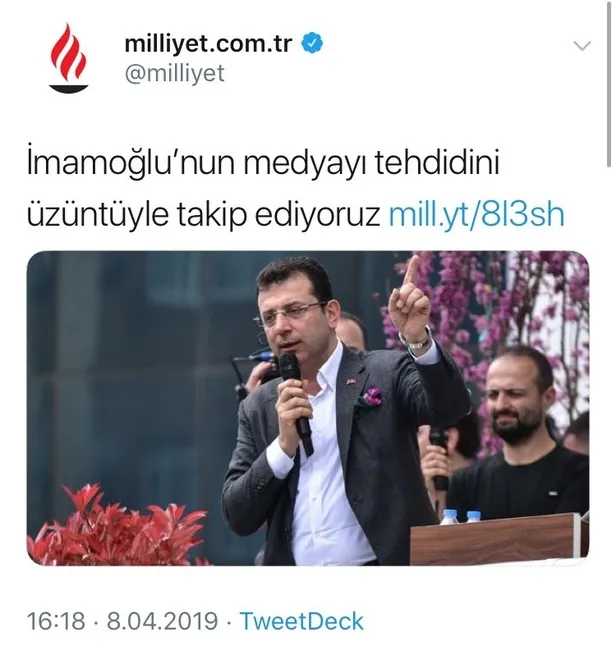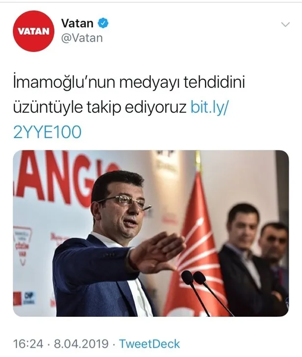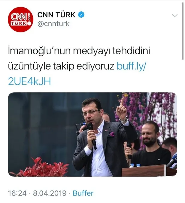 CHP'nin İstanbul Büyükşehir Belediye Başkanı adayı Ekrem İmamoğlu, "İsim veriyorum; NTV'yi Şahenk ailesini, Habertürk'ü, Ciner ailesini, CNN Türk'ü, Demirören ailesini takip ediyorum… Gün gelir isimlerini anmaktan bile vazgeçerim" ifadesimi kullanmıştı.