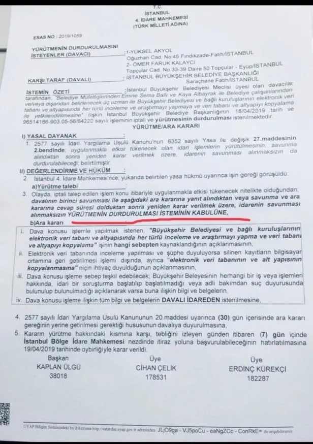 AK Parti'li meclis üyesi Yüksel Akyol ve Ömer Faruk Kalaycı, İstanbul 4. İdare Mahkemesine başvurarak "Belediye müfettişlerinden Emine Sema Ballı ve Kaya Albayrak ile belediye çalışanlarından veya dışarıdan belirlenecek 3 uzman ile belediye ve bağlı kuruluşların elektronik veri tabanı ve altyapılarında her türlü inceleme ve araştırmayı yapmaya ve veri tabanı ve altyapıyı kopyalamaya yetkilendirilmesine" ilişkin kararın iptali ile yürütmesinin durdurulmasını istedi.