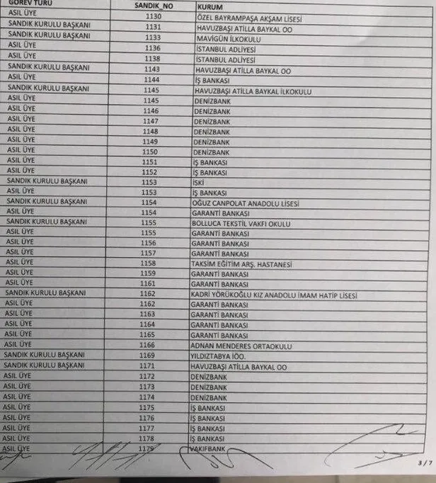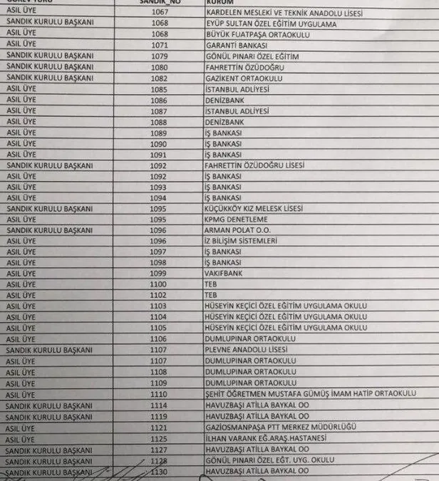 İstanbul'da; 1089, 1090, 1091, 1092, 1093, 1094, 1097, 1098, 1151, 1152, 1153, 1175, 1176, 1177 ve 1178 No'lu sandıklarda, İş Bankası'nda çalışanların sandık kurulu asil üyesi olarak görev yaptığı tespit edildi.