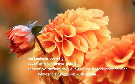* Bugün Bayram! Mübarek Ramazan Bayramı Tüm insanlar birbirlerine daha çok yakınlaşsın, dargınlıklar ortadan kalksın, kardeşlik ve dostluk duyguları daha da kuvvetlensin. Tüm insanlar neşe ve mutluluk denizinde yüzsün. Bugün sevinç günü, kederleri bir yana bırakıp mutlu olalım. Ramazan Bayramı'nı doya doya yaşıyalım. Hayırlı bayramlar.