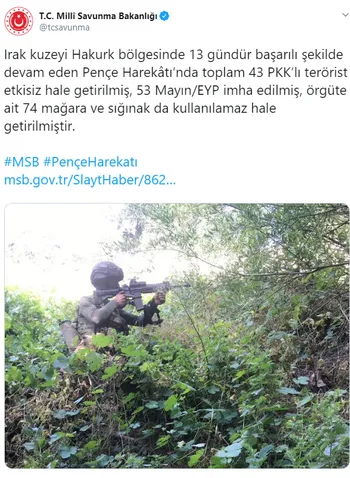 Milli Savunma Bakanlığı'ndan yapılan açıklamada, "Irak kuzeyi Hakurk bölgesinde 27 Mayıs 2019 tarihinde başlayan ve planlandığı şekilde başarıyla devam eden Pençe Harekâtı'nda; harekâtın başlangıcından bu güne kadar toplam 43 PKK'lı terörist etkisiz hale getirilmiştir. Harekât kapsamında örgüt tarafından tuzaklanan 53 adet Mayın/EYP tespit edilerek imha edilmiş; bölücü teröristlere ait 74 mağara ve sığınak da kullanılamaz hale getirilmiştir." denildi.
