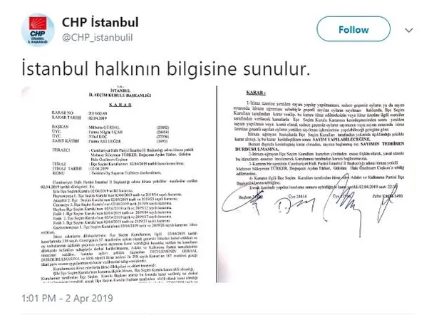 CHP İstanbul İl Başkanlığı; 2 Nisan 2019 tarihinde sosyal paylaşım sitesi Twitter'daki hesabından, "İstanbul halkının bilgisine sunulur" ifadelerini paylaştı ve paylaşımın altına İstanbul İl Seçim Kurulu'nun, 2 Nisan gecesi aldığı karar paylaşıldı.