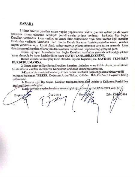 2 Nisan 2019 saat:22.10 İstanbul İl Seçim Kurulu Başkanı hakim Müberra Gürdal, üye hakimler Fatma Nigar Uçar ve Nihal Koç, CHP'nin 7 ilçede ''yeniden oy sayımının tedbiren durdurulmasına'' ilişkin talebini kabul ederek, söz konusu bölgelerde sayıma başlanmış ise sayımın tedbiren durdurulmasına hükmetti.