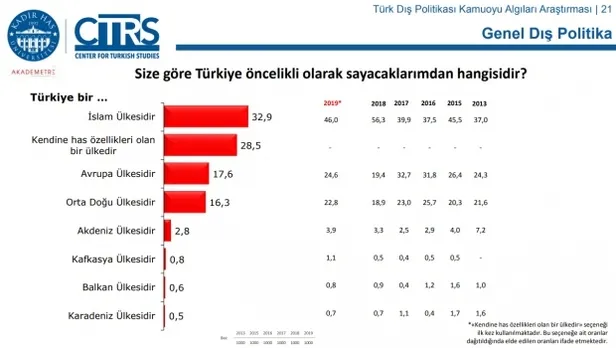 Araştırmaya göre, 'Türkiye bir İslam ülkesidir' diyenlerin oranı yüzde 46 ile bu yıl da ilk sırada yer aldı. Aynı kategoride Türkiye'yi Avrupa ülkesi olarak tanımlayanların oranı ise yüzde 17,6 olurken, Orta Doğu ülkesi olarak tanımlayanların oranı ise yüzde 16,3 oldu. Bu yıl ilk kez sunulan, "Türkiye kendine has özellikleri olan bir ülkedir" yanıtını verenlerin oranı ise yüzde 28,5 oldu.