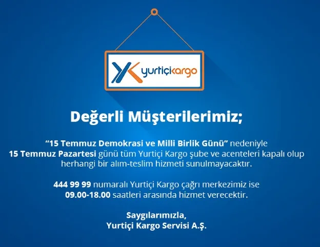 Yurtiçi Kargo 15 Temmuz'da tatil olduğunu sayfasında şu ilan ile duyurdu.