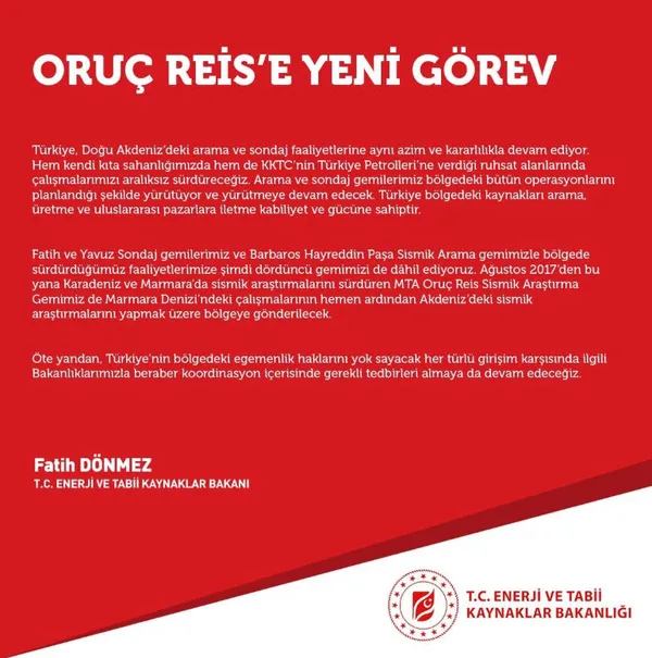 Fatih ve Yavuz sondaj gemilerimiz ve Barbaros Hayrettin Paşa Sismik Arama gemilerimizle bölgede sürdürdüğümüz faaliyetlerimize şimdi dördüncü gemimizi de dahil ediyoruz. Ağustos 2017'den bu yana Karadeniz ve Marmara'da sismik araştırmalarını sürdüren MTA Oruç Reis sismik araştırma gemimiz Marmara Denizi'ndeki çalışmalarının hemen ardından Akdeniz'deki sismik araştırmalarını yapmak üzere bölgeye gönderilecek.