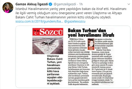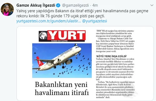 Açıklamada, Turhan tarafından söz konusu soru önergesine verilen yanıtta "İstanbul Havalimanı'nın kötü yere inşa edildiği" yönünde bir ifade kullanılmadığı belirtilerek, "Soru önergesi yanıtında yer aldığı gibi daha önce maden ocakları, kum ve kil ocaklarının bulunduğu iyi olmayan bir alan rehabilite edilerek güzel bir havalimanının inşa edildiği belirtilmiştir." ifadesine yer verildi.