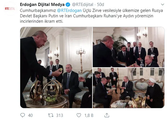 Cumhurbaşkanı Erdoğan'ın da Twitter hesabından retweet yaparak paylaştığı mesajda, "Cumhurbaşkanımız @RTErdogan Üçlü Zirve vesilesiyle ülkemize gelen Rusya Devlet Başkanı Putin ve İran Cumhurbaşkanı Ruhani'ye Aydın yöremizin incirlerinden ikram etti" ifadeleri kullanıldı.