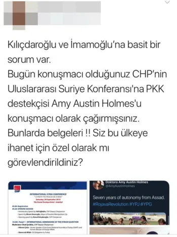 Bugün CHP tarafından İstanbul'da düzenlenen Uluslararası Suriye Konferansı'na terör örgütü PYD yandaşı Amy Austin Holmes'in davet edilmesine sosyal medyadan tepki yağdı. Bir Twitter kullanıcısı "Siz bu ülkeye ihanet için özel olarak mı görevlendirildiniz?" diyerek CHP Genel Başkanı Kemal Kılıçdaroğlu ve İBB Başkanı Ekrem İmamoğlu'na sert tepki gösterdi. CHP lideri Kılıçdaroğlu, konferansa terör örgütlerinin davet edilmeyeceği sözünü vermişti. CHP'nin davet ettiği Holmes, uluslararası alanda terör örgütü PYD'nin çalışmalarına destek veriyor. Amerika'da ve Avrupa'da PYD lehine lobi çalışmalarında aktif rol alıyor.