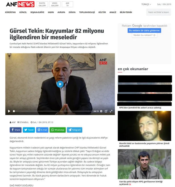 CHP'li Tekin'in verdiği demecin yayınlandığı sayfada, terör örgütü PKK'nın propaganda haberleri yer alıyor. Sayfanın hemen sağında, örgütün hain saldırısı ve 'şehit' olarak nitelendirilen eli kanlı teröristlere dair haberler yer alıyor.