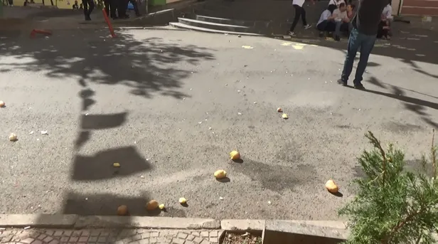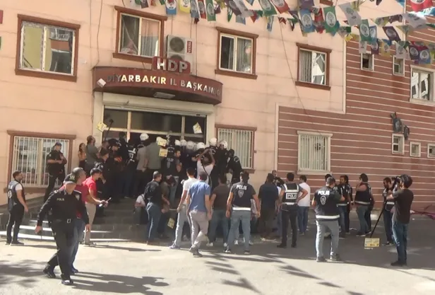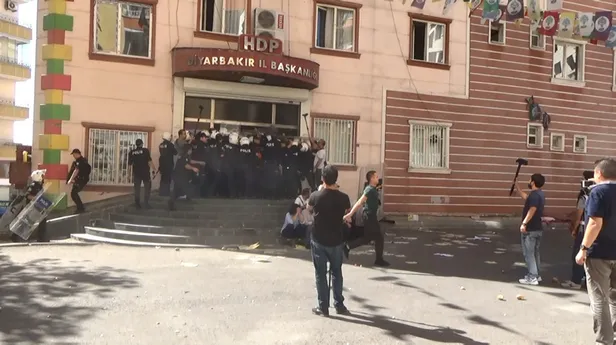 HDP'liler, aşağıda güvenlik önlemi alan polislere sıcak su ile cam bardak, tahta, patates ve soğan attı. HDP'lilerin saldırısı sırasında polisler, kalkanlarıyla korunmaya çalışırken, parti binası önünde oturma eylemi yapan aileler de güvenli bölgeye alındı.