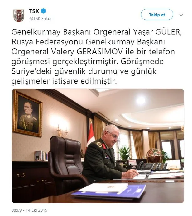 Son dakika: Genelkurmay Başkanı Orgeneral Yaşar Güler, Valery Gerasimov ile telefon görüştü