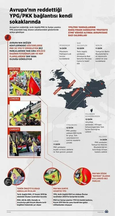 Avrupa'nın reddettiği, terör örgütü PKK ile Suriye uzantısı YPG arasındaki bağ, kıtanın sokaklarındaki gösterilerde açıkça görülüyor. Gösterilerde PKK ve YPG'yi simgeleyen bez parçalarının yanı sıra bölücü başının fotoğrafları ve HDP flamalarının yan yana olduğu görülüyor. Bu protestolarda sık sık PKK lehine slogan atılırken, terör örgütünün sözde marşı da söyleniyor.