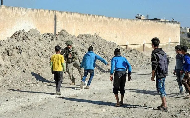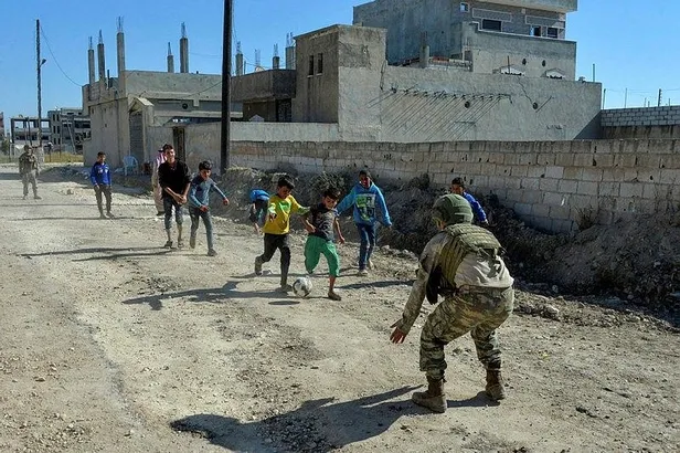 Barış Pınarı Harekatı ile Rasulayn'da güvenliği sağlayan Mehmetçik, geçirdikleri zor günleri unutmaları için bölgede bulunan çocukların oyunlarına eşlik ediyor.