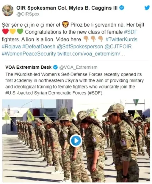 Albay Caggins, Amerika'nın Sesi (VOA) televizyonunun YPG/PKK terör örgütünün kadın kolu YPJ'nin ABD destekli eğitimlerini tamamlamasına ilişkin paylaştığı görüntüleri, terör örgütü PKK'nın "Aslan aslandır, ha dişi ha erkek" sloganıyla paylaştı.