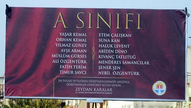 CHP'li Adana Büyükşehir Belediye Başkanı Zeydan Karalar'ın 24 Kasım Öğretmenler Günü'nde kentin değişik noktalarına astırdığı ve "A Sınıfı" dediği bazı Adanalı ünlüler ile sanatçıların adını taşıyan reklam panosunda sadece 16 ismin yazılması tepki topladı.